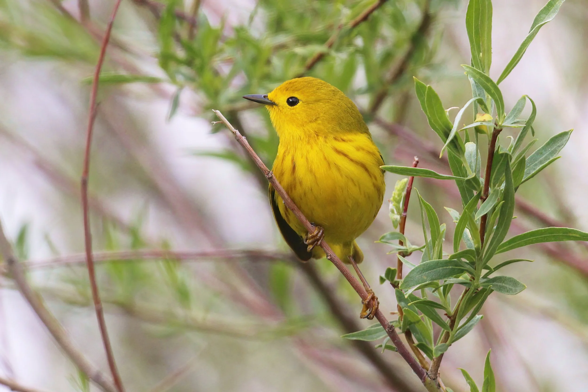 Most common species — including Yellow Warblers (shown here), Yellow-rumped Warblers and Wilson’s Warblers — arrive in April and stay until September or October. Most are primarily yellow, a helpful trait since they hide out in willows and other leafy streamside vegetation.