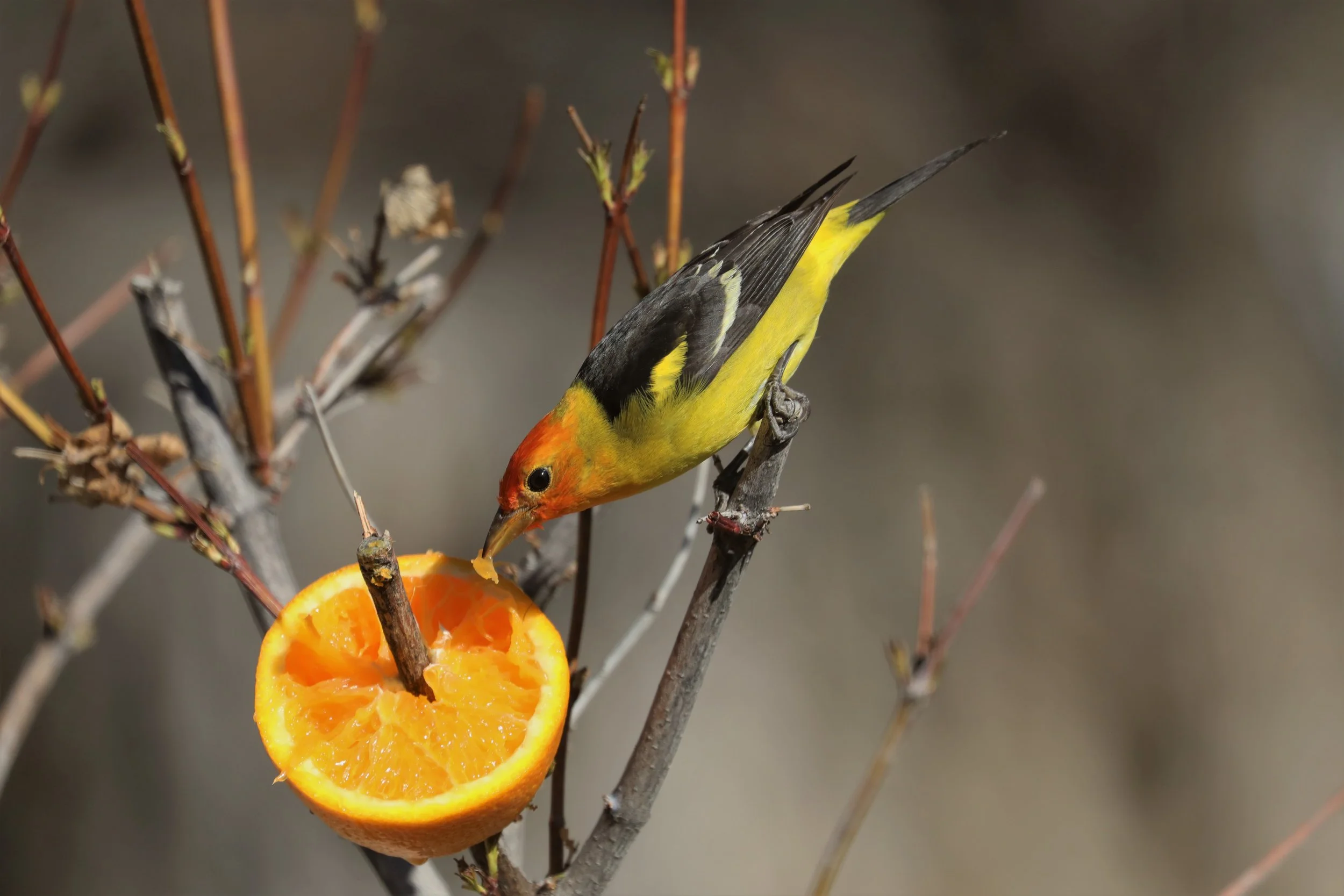 Local birder Chuck Gates (whose gorgeous photos are shown here) says that from late April to early May, you can coax them into wooded yards by setting out orange halves and other fresh fruit.